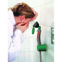 Die ClassicLine Hand-Augendusche mit einem Hochleistungs-Brausekopf kann auf der Wand- und auf dem Tisch fest installiert in Betrieb genommen werden. Dieses Modell ist ideal für Laboratorien, Reinräume und Industriebereiche und wurde entwickelt, um in Notfällen rasch handeln zu können. Der ergonomisch geformter Handgriff ist mit einem arretierendem Auslösegriff aus Kunststoff integriert. Der Brausekopf ist mit einer verkalkungsarmen Kunststoffsprühplatte inklusiver Gummischutz und einem dichtschließendem Staubdeckel mit Klappmechanismus montiert. Diese Augendusche enthält einen Rückflussverhinderer um das Trinkwasser zu schützen.