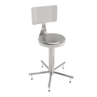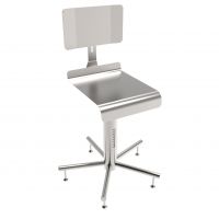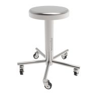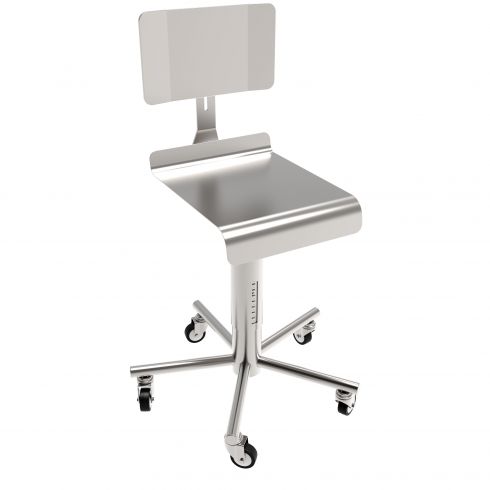 Komplett hergestellt aus Edelstahl 1.4301. Sitzabmessung 400x450mm, höheverstellbar von 500 bis 600mm. Rückenlehne einfach und ohne Werkzeug einstellbar. Untergestell mit 5 Edelstahlspeiche. Auf Lenkrollen Durchmesser 80mm und mit Edelstahlkupplung. Komplett demontierbar, um eine optimale Sterilisation in Autoklav von allen Teilen zu ermöglichen.