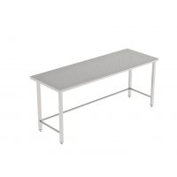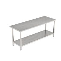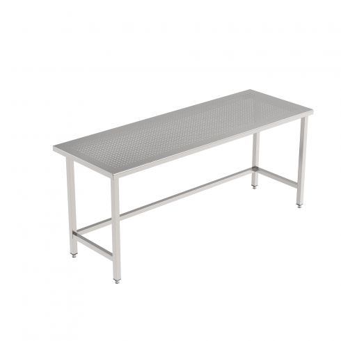 Frame made of stainless steel 1.4301 square tube 40x40mm, 1,00mm thick, fully welded. Rear legs 80mm forward offset for cove. Rear and side reinforced with stainless steel bars. Perforated worktop made of 1.50mm stainless steel sheet 1.4301, with 9mm perforation and 60mm smooth all around frame. Rounded front edge (R=10mm), and rounded (R=2mm) rear and side edges. On height adjustable feet.